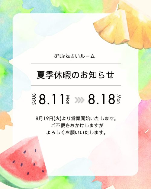 スケジュール 2025.08.10 夏季休暇のお知らせ(8/11~8/18) いつもご来店頂きありがとうございます。 8/11(月)~8/18(月)の期間中、お休みさせて頂きます。 ご不便をおかけしますが、どうぞよろしくお願いいたします。 Xでシェア Facebookでシェア URLをコピー